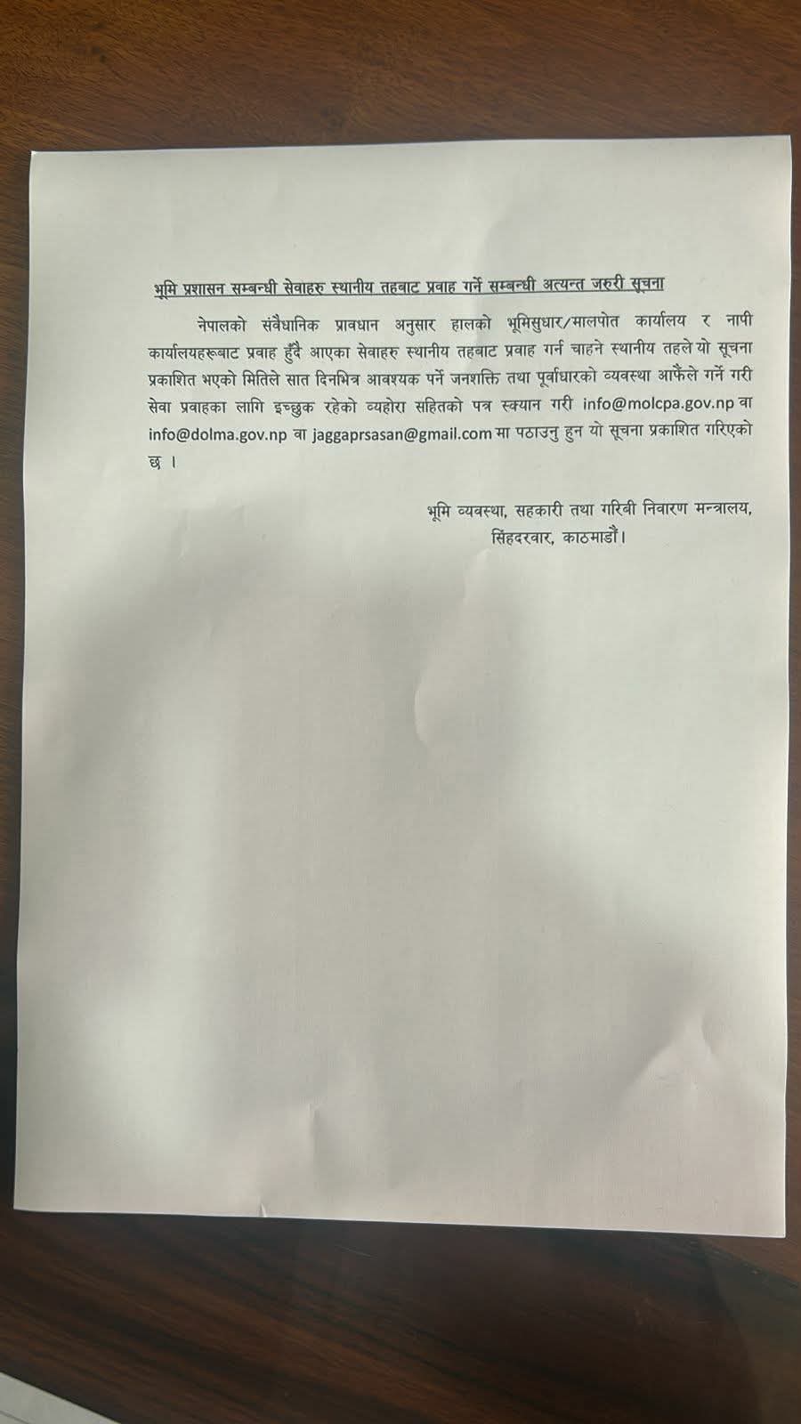 लामो समयदेखि भ्रष्टाचार र ढिलासुस्तीको अखडाका रूपमा बदनामी कमाएका मालपोत कार्यालयहरूलाई विस्थापित गरी स्थानीय सरकारलाई जिम्मेवारी सुम्पिने यो तयारीले संघीयताको मर्मलाई तल्लो तहसम्म पु¥याउने अपेक्षा गरिएको छ। यदि स्थानीय तहहरूले द्रुत गतिमा जनशक्ति व्यवस्थापन गरी यो जिम्मेवारी सम्हालेमा नागरिकले आफ्नै वडा वा पालिकाबाट सहजै सेवा पाउनेछन्। मन्त्रालयले विभागको इमेल वा तोकिएको ठेगानामा आधिकारिक पत्र स्क्यान गरी पठाउन भनेकाले अबको एक साताभित्र कति स्थानीय तह यो भार थाम्न तयार हुन्छन् भन्ने कुराले नै जग्गा प्रशासनको भविष्य निर्धारण गर्नेछ ।