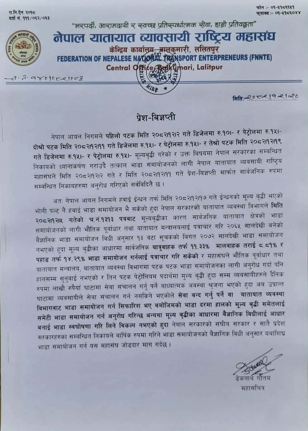 काठमाडौँ नेपाल यातायात व्यवसायी राष्ट्रिय महासंघले सरकारलाई यथाशीघ्र सार्वजनिक सवारी साधनको भाडा वृद्धि गर्न अल्टिमेटम दिएको छ । इन्धनको मूल्यमा लगातार भइरहेको वृद्धि र महँगीका कारण सवारी सञ्चालन गर्न नसक्ने अवस्था आएको भन्दै व्यवसायीहरूले आन्दोलनको घोषणा गरेका हुन् ।