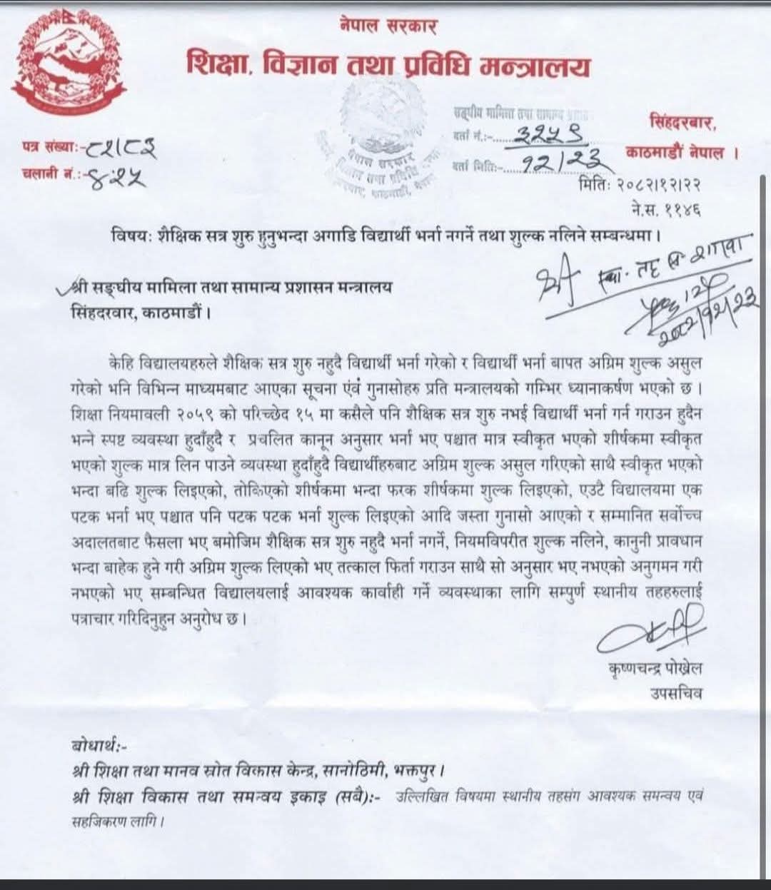 मन्त्रालयद्वारा जारी गरिएको परिपत्रमा शिक्षा नियमावली २०५९ को परिच्छेद १५ को व्यवस्थालाई स्मरण गराउँदै कुनै पनि हालतमा शैक्षिक सत्र सुरु नभई भर्ना गराउन नपाइने स्पष्ट पारेको छ । प्रचलित कानुन अनुसार तोकिएको शीर्षकभन्दा बाहिर गएर वा स्वीकृत शुल्कभन्दा बढी रकम असुल्नु अवैध ठहरिने मन्त्रालयको भनाइ छ। सम्मानित सर्वोच्च अदालतको फैसलालाई समेत उद्धृत गर्दै मन्त्रालयले नियम विपरीत लिइएका सबै शुल्क तत्काल फिर्ता गर्न र नियम मिच्ने विद्यालयहरूलाई आवश्यक कानुनी कारबाहीको दायरामा ल्याउन सबै स्थानीय तहहरूलाई पत्राचार गरेको छ ।